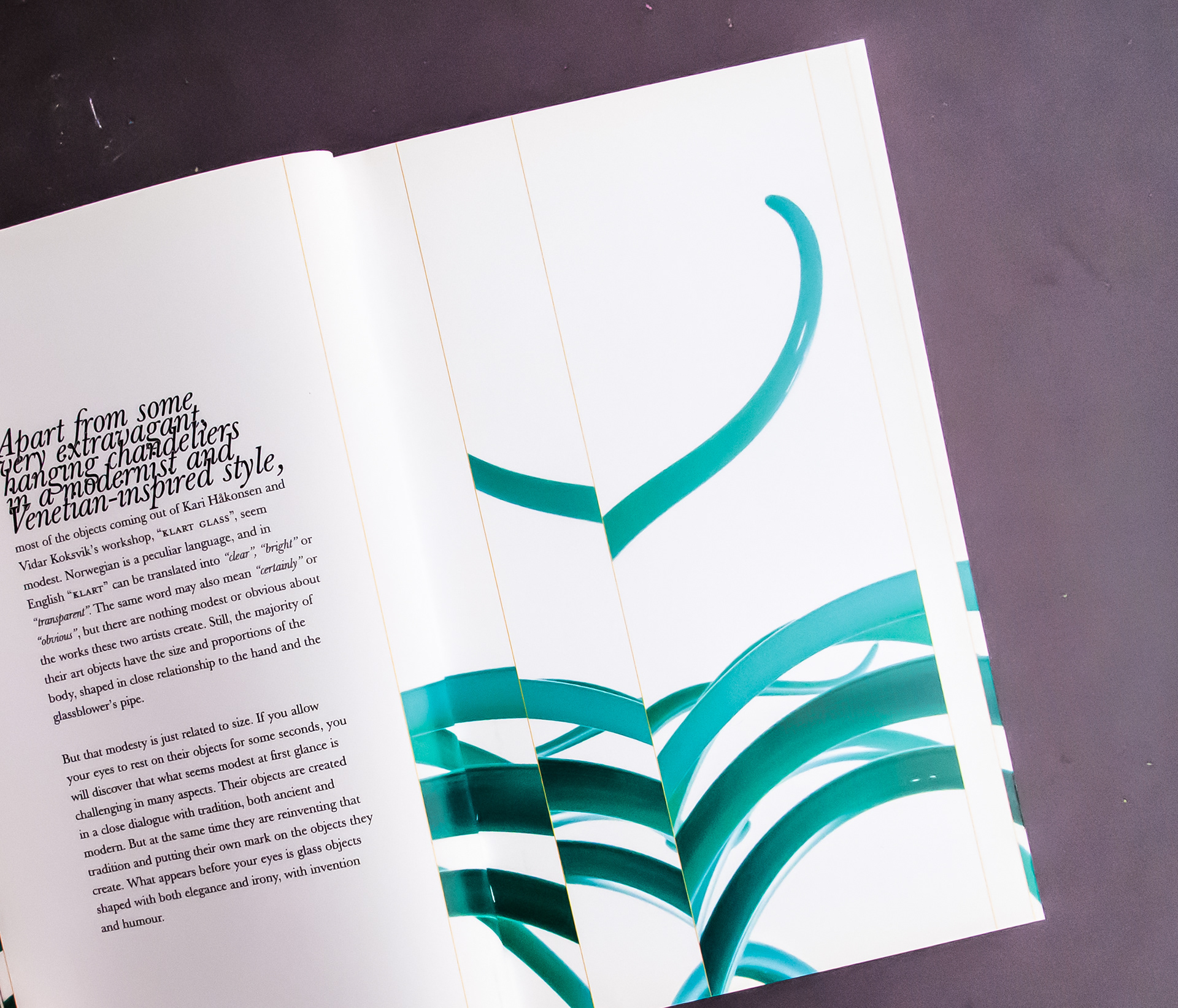 Katalogdesign: klArt / Glasskunstnere Katalog: Stor retrospektiv katalog for klArt. Katalogen ble laget i fobindelse med utstilling på 100% Design i London. Arbeidene deres benyttes som dekorative designelementer gjennomgående i katalogen. De er i stor grad organiske, noe som også ble førende for det typografiske uttrykket.